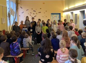 Zum Auftakt versammelten sich alle Kinder zu einem stimmungsvollen Einstieg mit Herbstliedern, Gedichten und einem kleinen Frederick-Theaterstück, das an das bekannte Bilderbuch „Frederick“ von Leo Lionni angelehnt war. Wie die kleine Maus Frederick sammelten auch wir an diesem Tag viele bunte Wörter, Gedanken und Ideen für die bevorstehenden Herbsttage.
