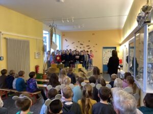 Zum Auftakt versammelten sich alle Kinder zu einem stimmungsvollen Einstieg mit Herbstliedern, Gedichten und einem kleinen Frederick-Theaterstück, das an das bekannte Bilderbuch „Frederick“ von Leo Lionni angelehnt war. Wie die kleine Maus Frederick sammelten auch wir an diesem Tag viele bunte Wörter, Gedanken und Ideen für die bevorstehenden Herbsttage.